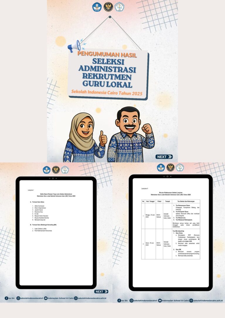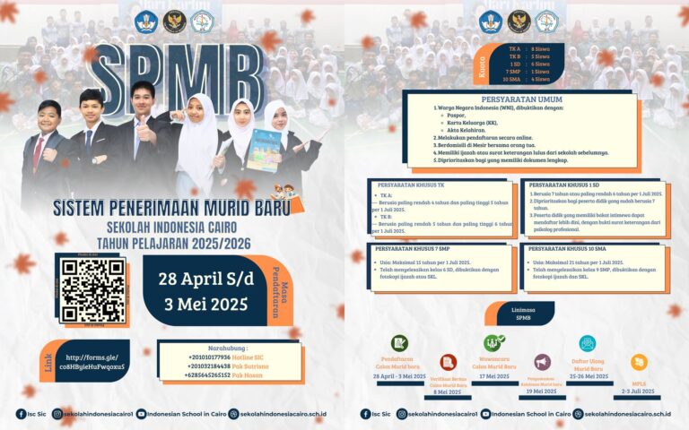 Saatnya Bergabung di Sekolah Indonesia Luar Negeri Terbaik di Kairo!Sekolah Indonesia Cairo membuka Sistem Penerimaan Murid Baru (SPMB) Tahun Pelajaran...