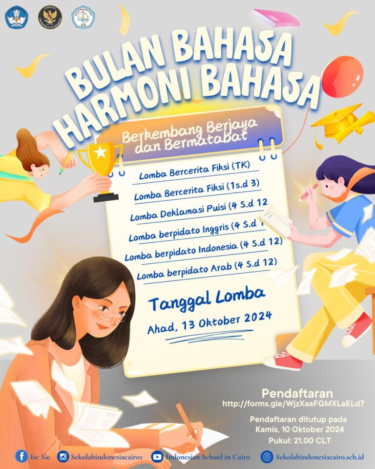 Sehubungan dengan adanya peringatan hari "Bulan Bahasa", Sekolah Indonesia Cairo akan mengadakan berbagai jenis lomba untuk menggali potensi akademik siswa...