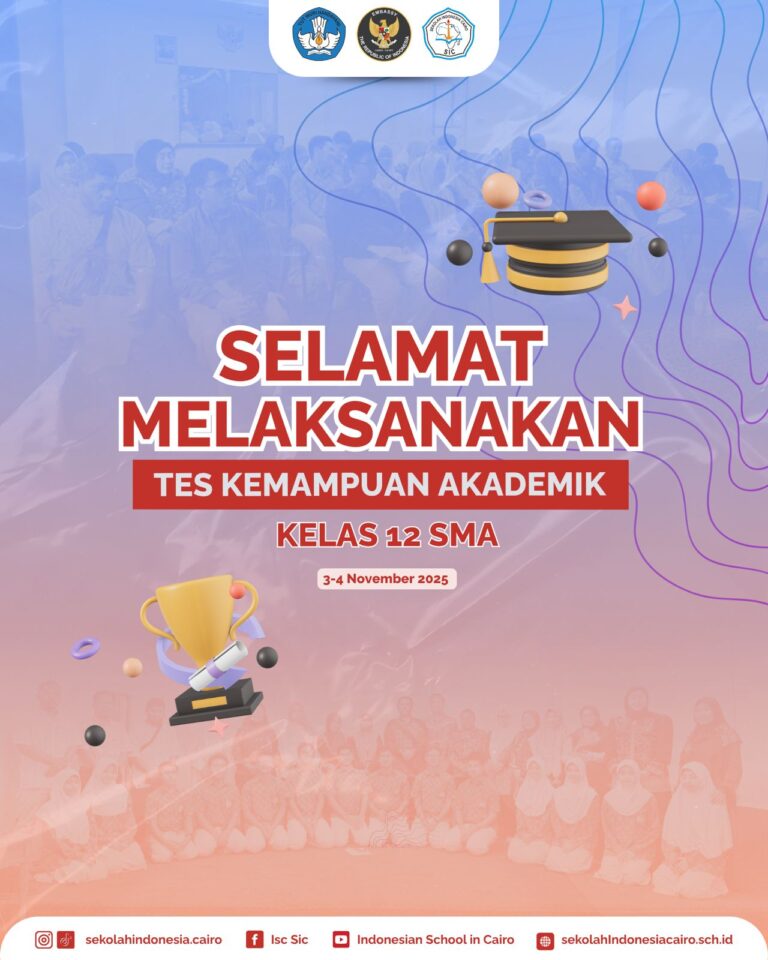 Sekolah Indonesia Cairo mengucapkan selamat dan sukses kepada seluruh siswa kelas 12 SMA yang akan melaksanakan Tes Kemampuan Akademik pada...