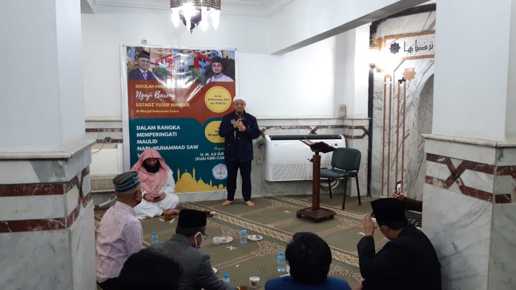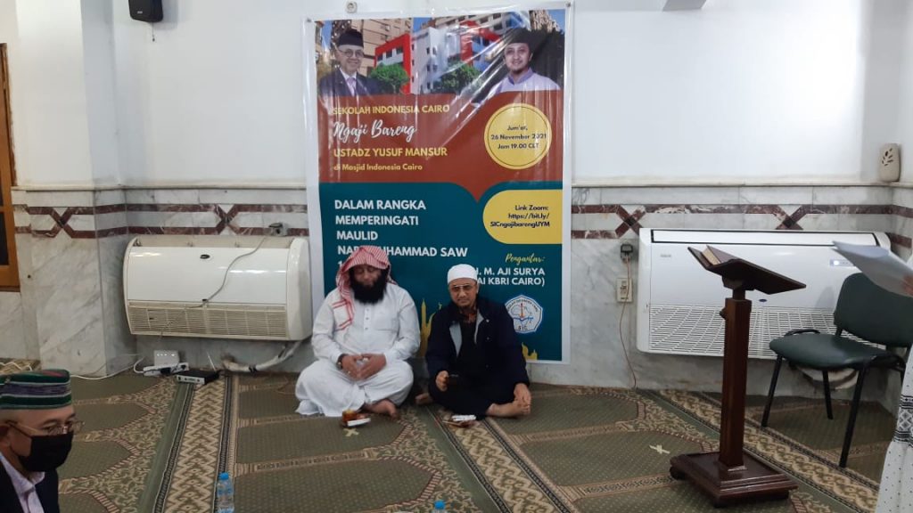 Cairo, 26 November 2021- Dalam rangka memperingati maulid Nabi Muhammad SAW tahun 1443 H, Sekolah Indonesia Cairo mengadakan kegiatan “Ngaji Bareng” Ustadz Yusuf Mansur yang diadakan di Masjid Indonesia Cairo pada tanggal 26 November 2021. Kegiatan tersebut dihadiri oleh Ustadz Yusuf Mansur berserta rombongannya, KUAI KBRI Cairo Bapak M. Aji Surya, Home Staff dan Lokal Staff KBRI Cairo, Orang tua/Wali murid Sekolah Indonesia Cairo, Siswa Sekolah Indonesia Cairo, serta seluruh warga diaspora yang berada di Mesir. Kegiatan tersebut dilaksanakan sesuai dengan protokol kesehatan yang berlaku.