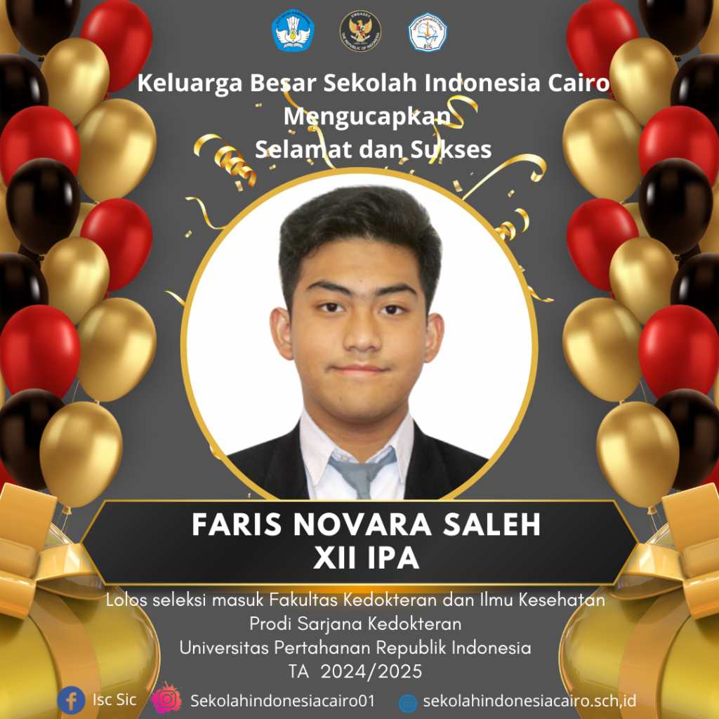 Hari ini, Keluarga Besar Sekolah Indonesia Cairo dengan bangga mengumumkan keberhasilan salah satu putra terbaik, Ananda Faris Novara Saleh, yang telah diterima di Fakultas Kedokteran dan Ilmu Kesehatan, Program Studi Kedokteran, Universitas Pertahanan Republik Indonesia TA 2024/2025.