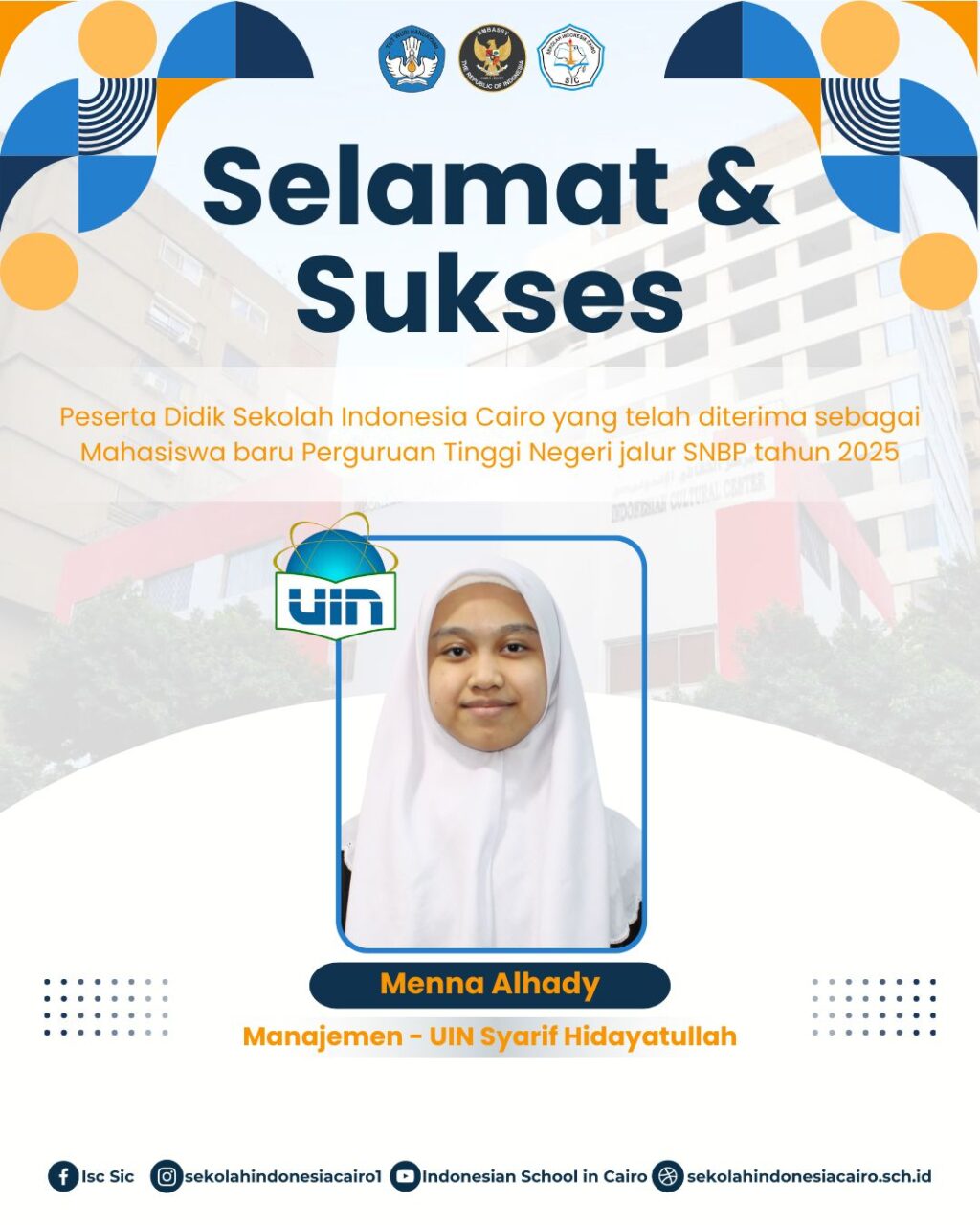 Sekolah Indonesia Cairo dengan bangga mengucapkan Selamat dan Sukset kepada Menna Alhady yang telah diterima sebagai Mahasiswa Baru di Perguruan Tinggi Negeri melalu Jalur SNBP tahun 2025, pada Program studi Manajemen, Universitas Islam Negeri (UIN) Syarif Hidayatullah Jakata.