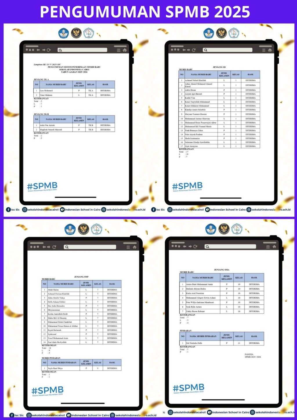 tentang Penetapan Hasil Seleksi Sistem Penerimaan Murid Baru (SPMB) Sekolah Indonesia Cairo Tahun Pelajaran 2025/2026, dengan ini diumumkan bahwa: