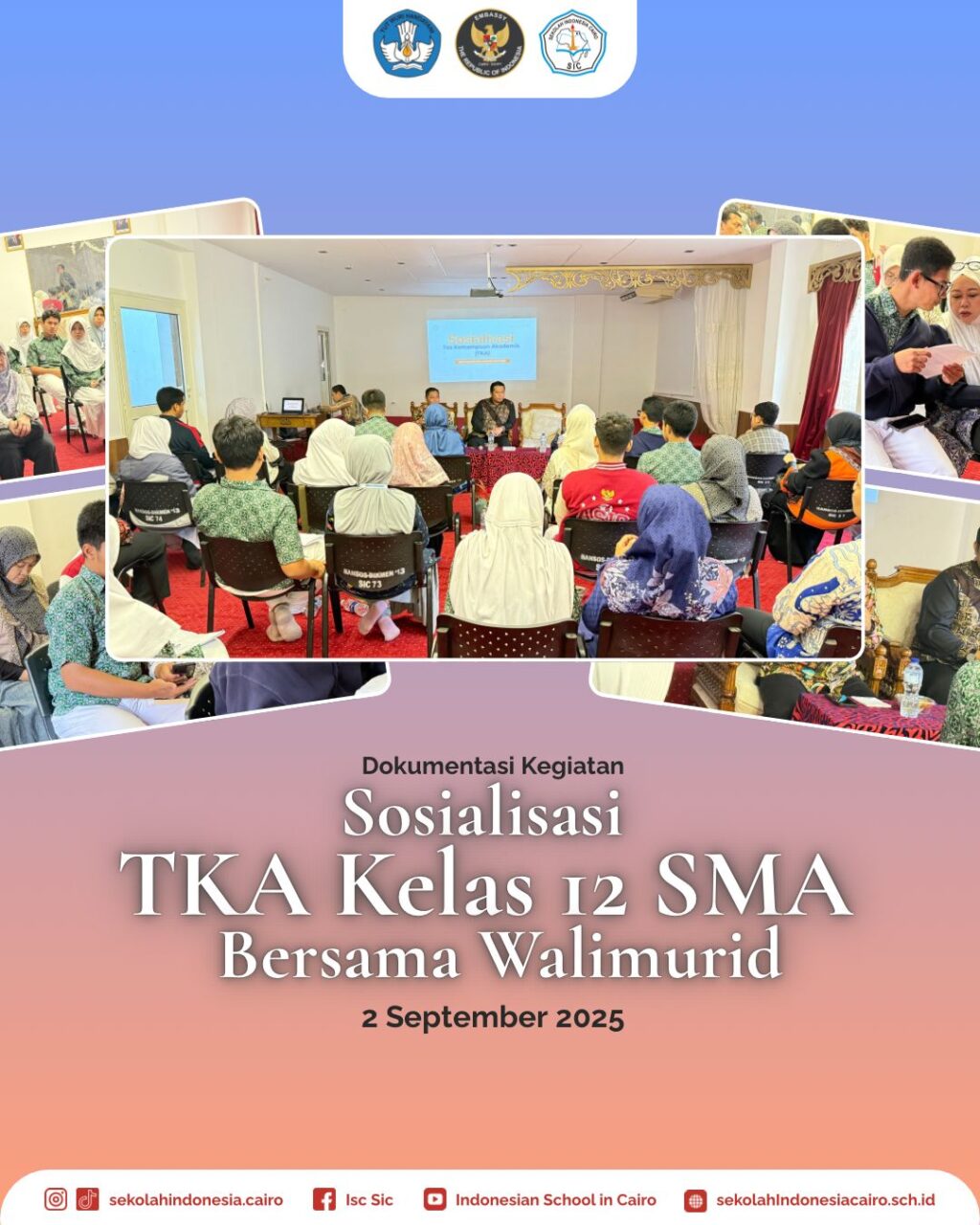Sekolah Indonesia Cairo menyelenggarakan kegiatan Sosialisasi TKA (Tes Kemampuan Akademik) bersama murid dan walimurid kelas 12. Kegiatan ini menjadi salah satu langkah penting dalam mendukung siswa kelas akhir untuk mempersiapkan diri menghadapi dunia perkuliahan.