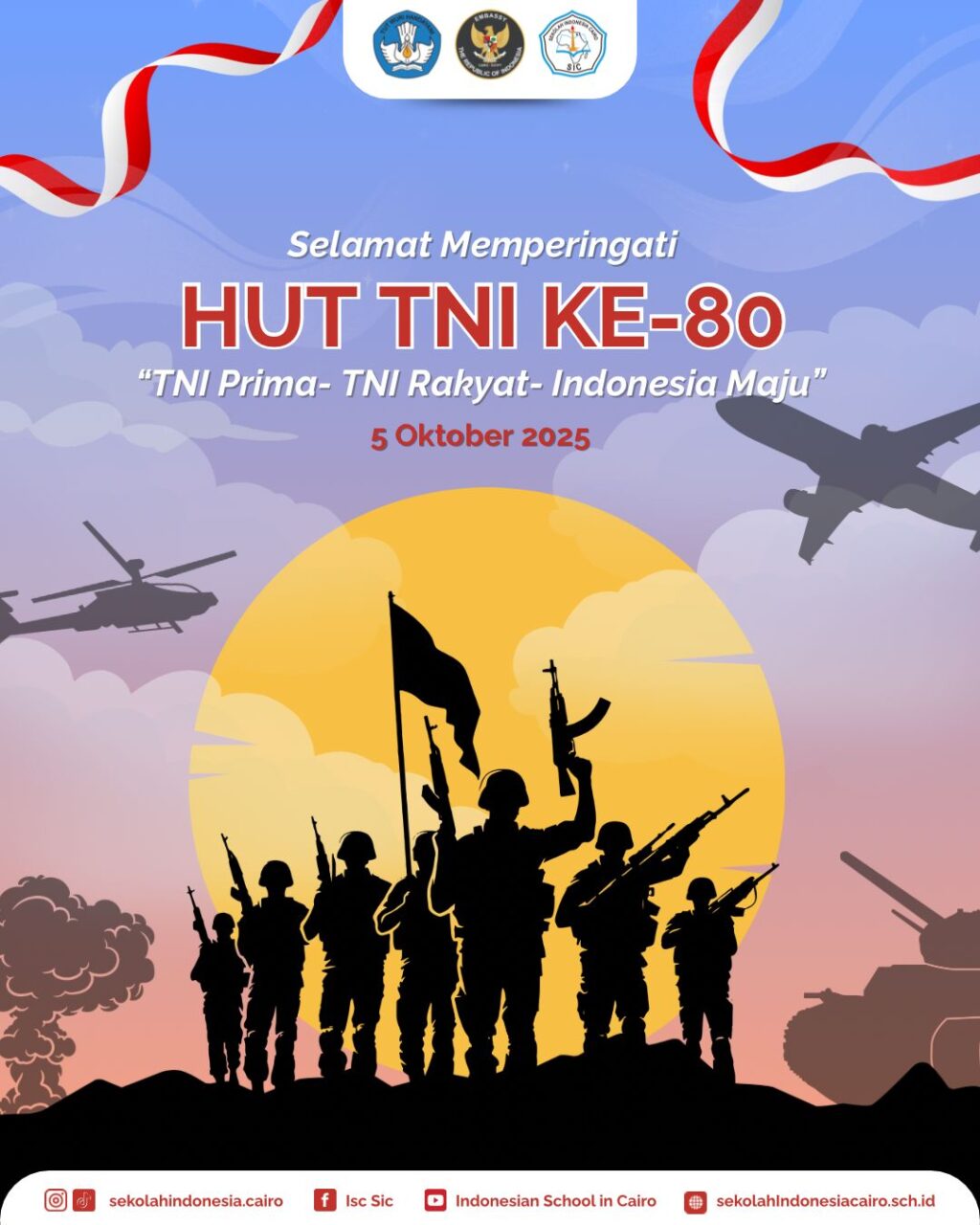 Sekolah Indonesia Cairo mengucapkan terima kasih dan penghargaan setinggi-tingginya kepada Tentara Nasional Indonesia atas dedikasi, pengabdian, dan perjuangannya dalam menjaga kedaulatan bangsa serta mengawal persatuan dan kemajuan Indonesia.