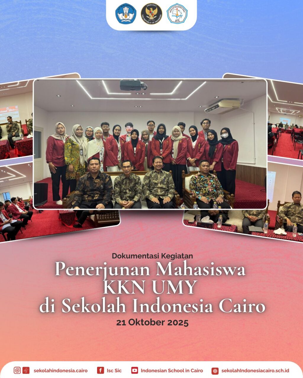 Pada Selasa, 21 Oktober 2025, Sekolah Indonesia Cairo menerima kedatangan mahasiswa Kuliah Kerja Nyata (KKN) dari Universitas Muhammadiyah Yogyakarta (UMY). Kegiatan penerjunan berlangsung di Aula Sekolah Indonesia Cairo dengan suasana hangat dan penuh semangat kolaborasi.