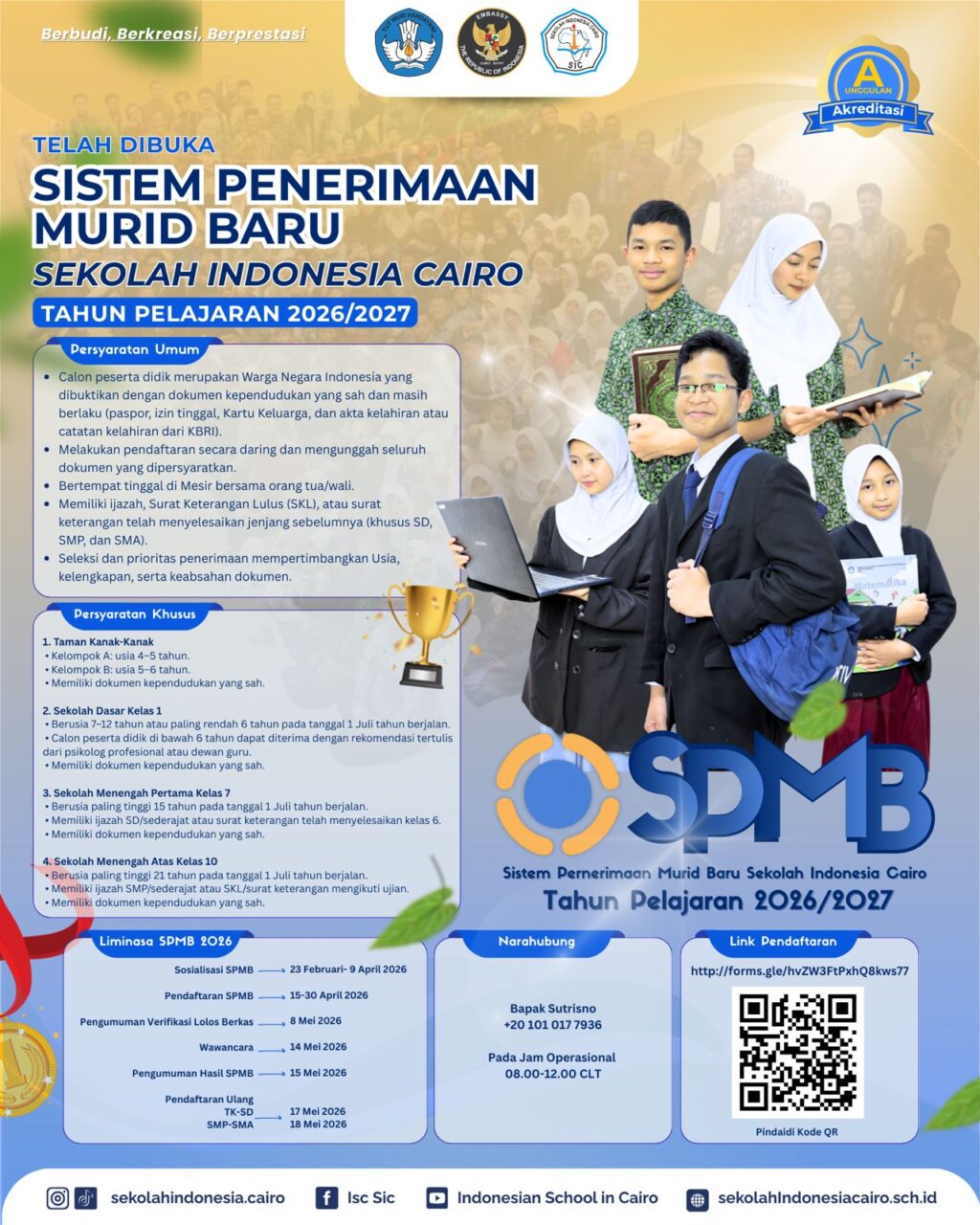 Bersama ini kami informasikan pembukaan pendaftaran murid baru untuk jenjang TK, SD, SMP, dan SMA di Sekolah Indonesia Cairo (SIC).